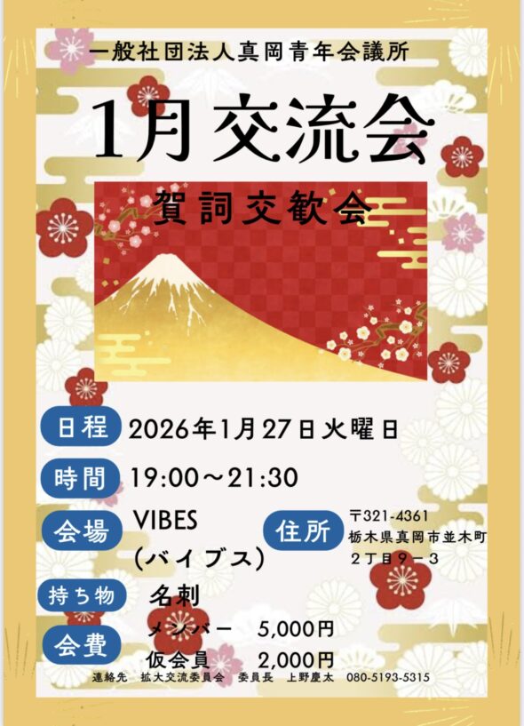 真岡青年会議所では、地域で活躍する多様な事業者の皆さまが、リラックスした雰囲気の中で交流できる場として、「1月交流会」を開催いたします。